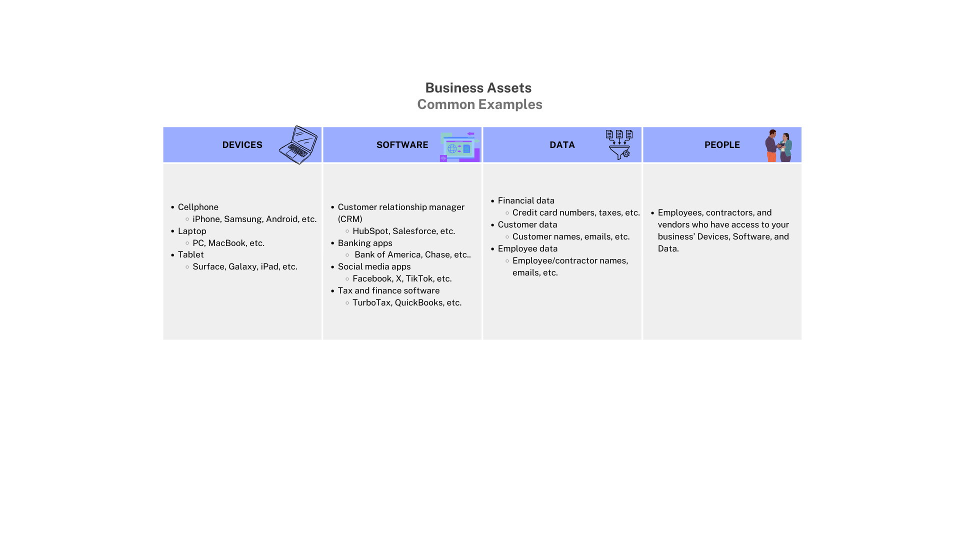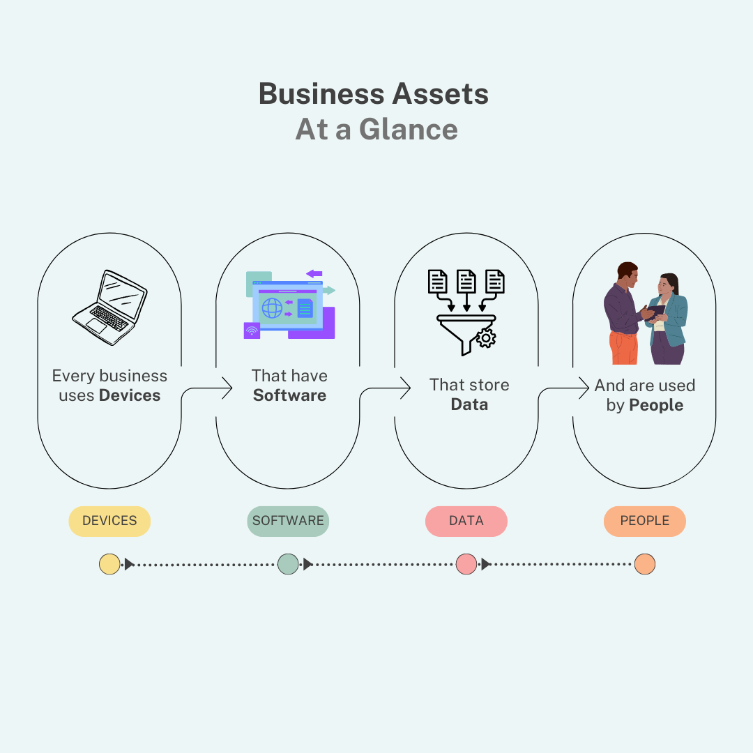 Your business assets are a mix of Devices, Software, Data, and People.