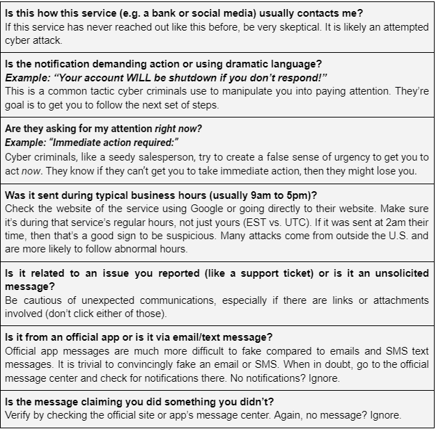 To help with this, we recommend implementing a policy of asking and answering these seven questions when you or your employees receive an unexpected or suspicious alert, text, or email.